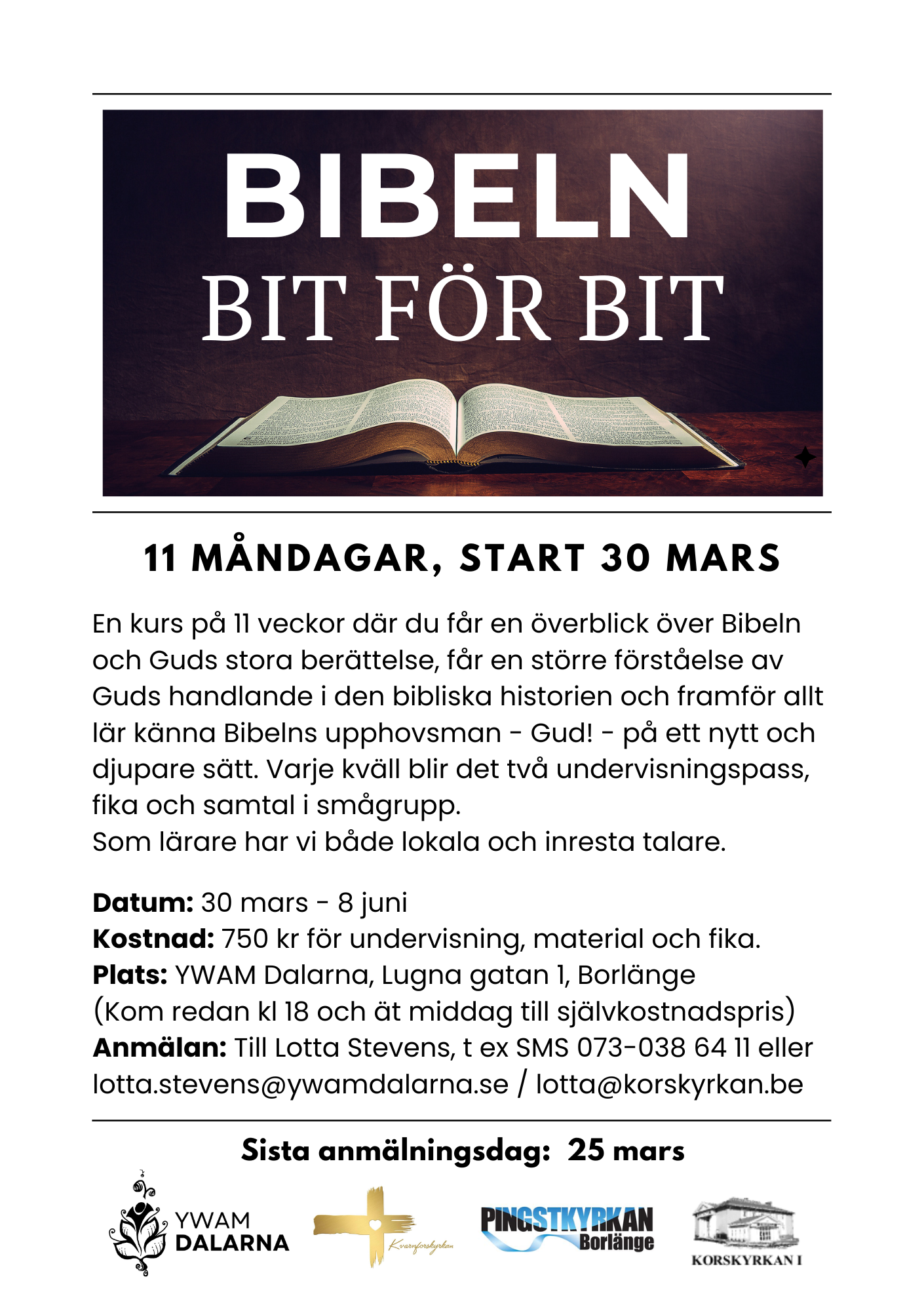 Anmäl dig senast 25 mars till lotta.stevens@ywamdalarna.se.