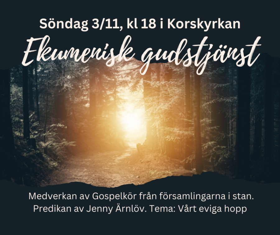 I Korskyrkan. Jenny Ärnlöv predikar. Ekumenisk gospelkör sjunger. Tema: Vårt eviga hopp.